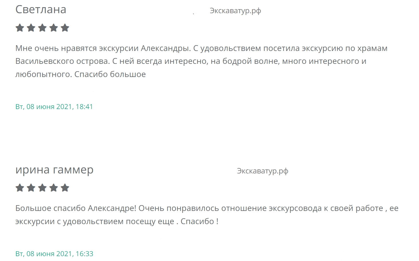 Периодически приезжаю погостить в Санкт-Петербург и с огромным удовольствием хожу на экскурсии Александры. Настолько интересно, информативно и живо рассказывать может только она! После каждой экскурсии появляется интерес к тому, о чём услышала. Сколько сайтов и книг прочитано «по следам» экскурсии сложно сказать.