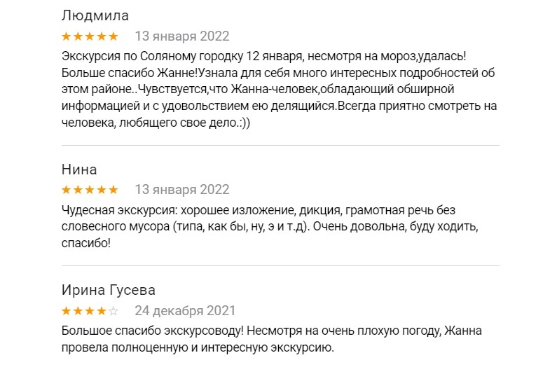 Прекрасная экскурсия по Соляному переулку , отличная речь , изобилие информации, логическое построение , экскурсия прошла на одном дыхании , с удовольствием пойду еще и рекомендую всем!