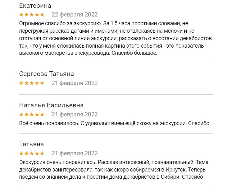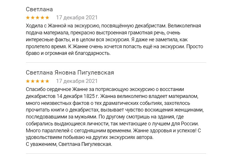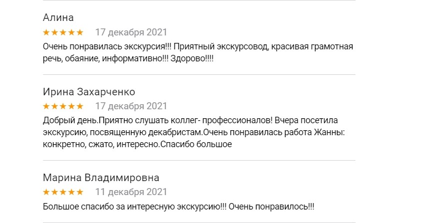 Прекрасная экскурсия о декабристах! Жанна рассказала много значимых подробностей, позволяющих ощутить место и время события двухсотлетней давности. Очень грамотная и компетентная подача материала без «сказок», которые так любят рассказывать многие экскурсоводы ради «красного словца». И рассказ Жанны от этого только выигрывает. Исторически точно и чисто подобран и представлен непростой материал. Получили большое удовольствие от экскурсии!