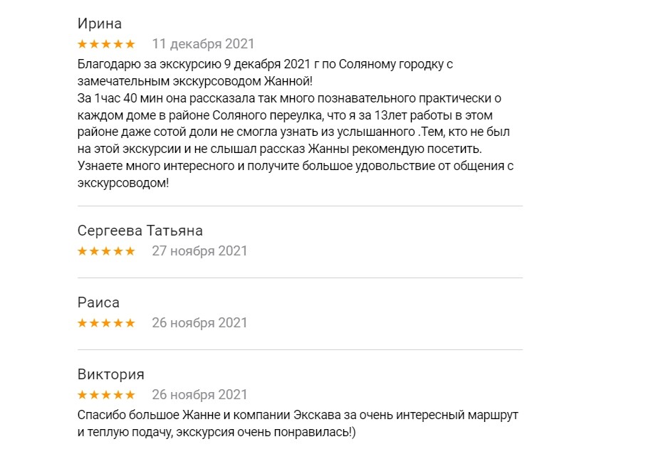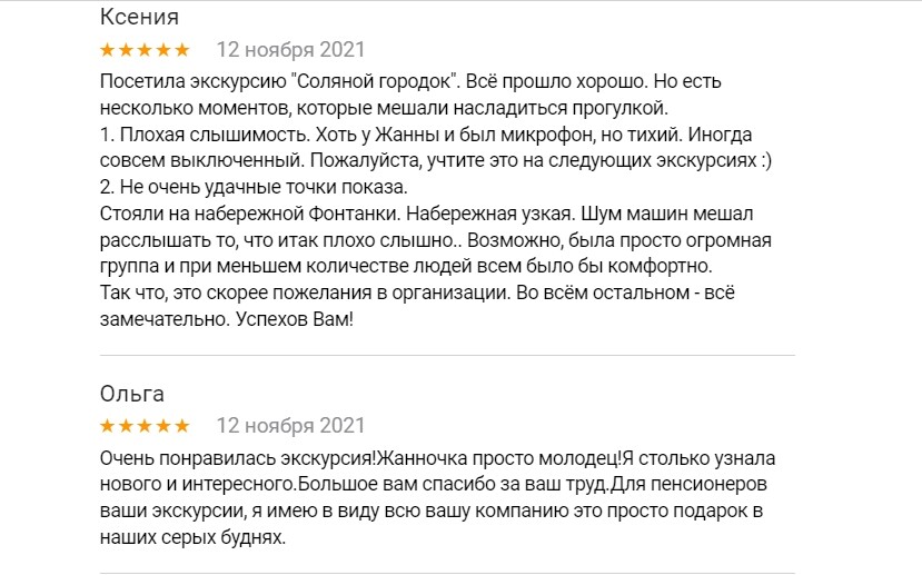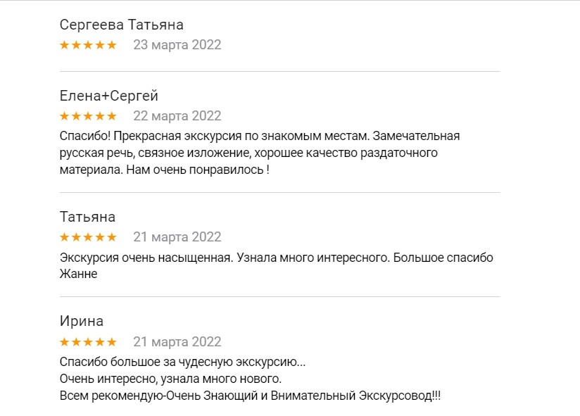 Большое спасибо! Я впервые на экскурсии Жанны и получила удовольствие от полученных знаний. Очень интересно, динамично. Всё чётко и понятно. Слышно было хорошо.